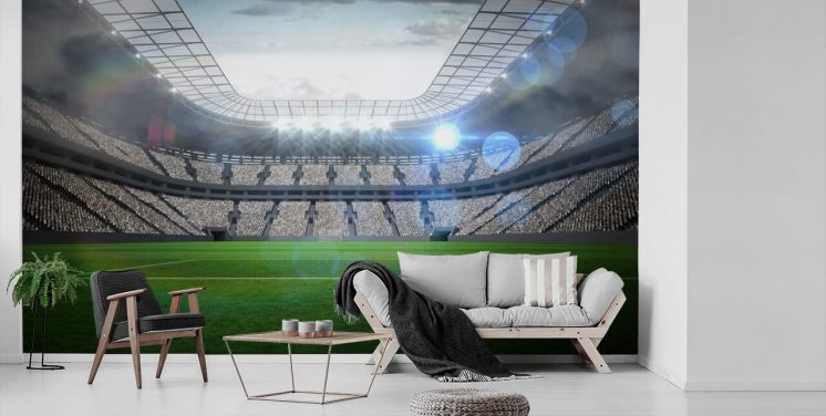 Wandbild „Großes Fußballstadion“, personalisierbar, grün und grau, mit Lichtern, für Kinder- und Jugendzimmer