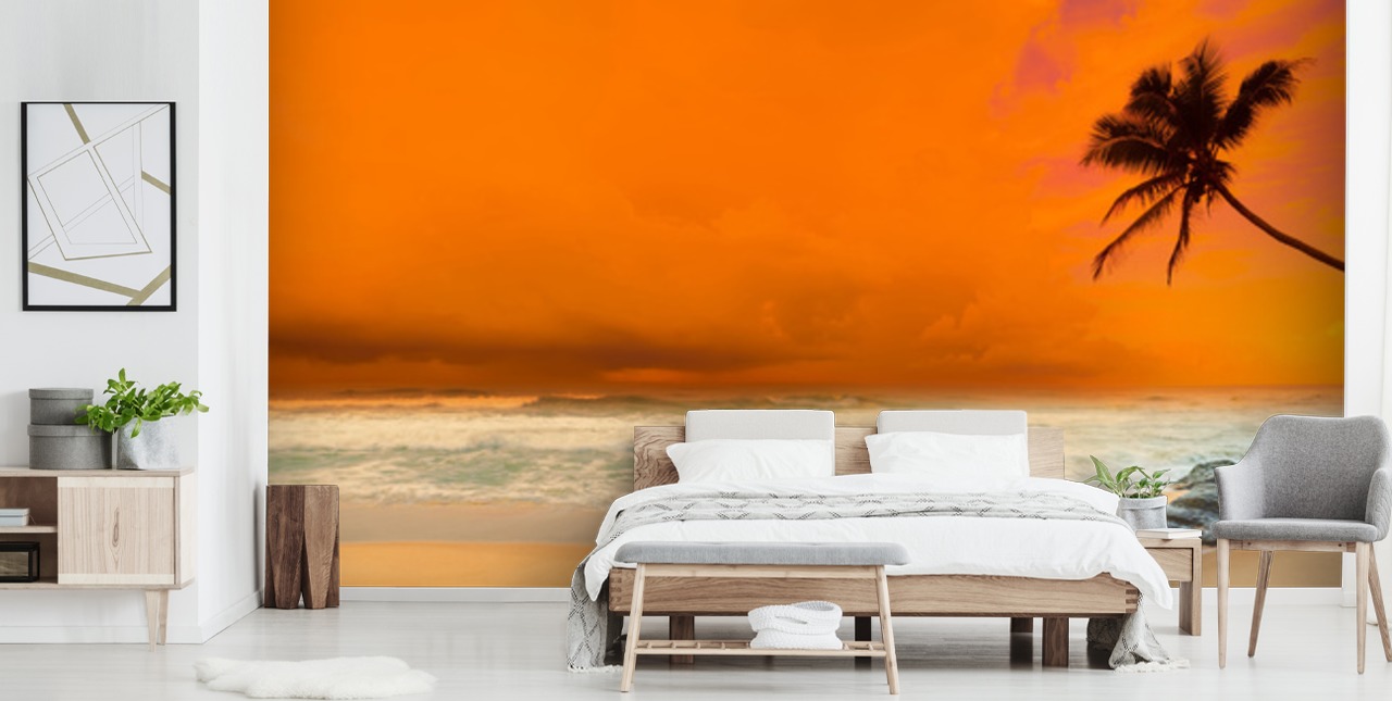 Schaffen Sie eine ruhige und entspannte Atmosphäre in Ihrem Zuhause mit der wunderschönen tropischen Strandtapete Sunset Over The Sea. Um einen genaueren Blick auf die warmen und verlockenden Farben dieses Wandbildes zu werfen, bestellen Sie jetzt Muster.