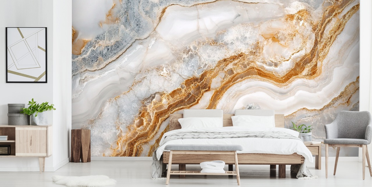 Weißer, grauer und goldener Wirbelmarmor - Weiße und goldene Marmortapete