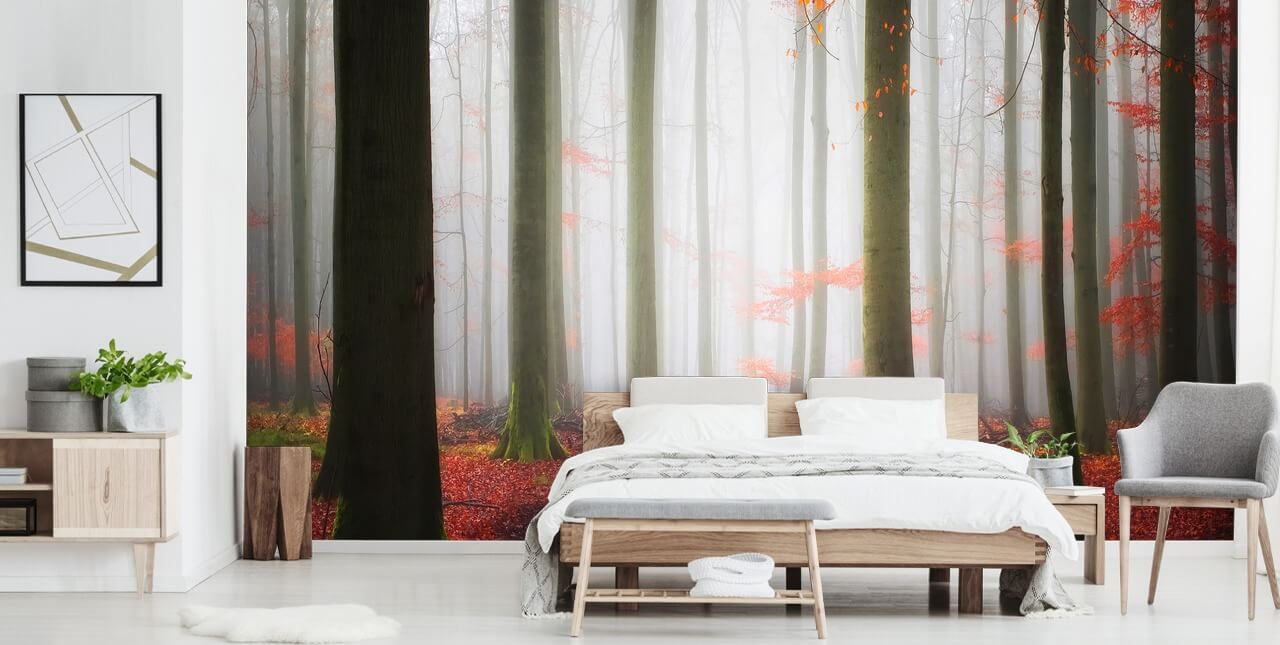 If Fall is your favourite season of the year, why not enjoy it all year round with this beautiful Autumnal Tracks wallpaper? Rich in tones of fiery red, pair this gorgeous tree wallpaper with red accessories as well as natural wooden furniture. If you choose to install this autumn forest wallpaper in your lounge, why not have a brown leather couch with red cushions, a red rug, and curtains? With all that red, try to make the rest of the room as subtle as possible with pastel grey or off-white painted walls.
