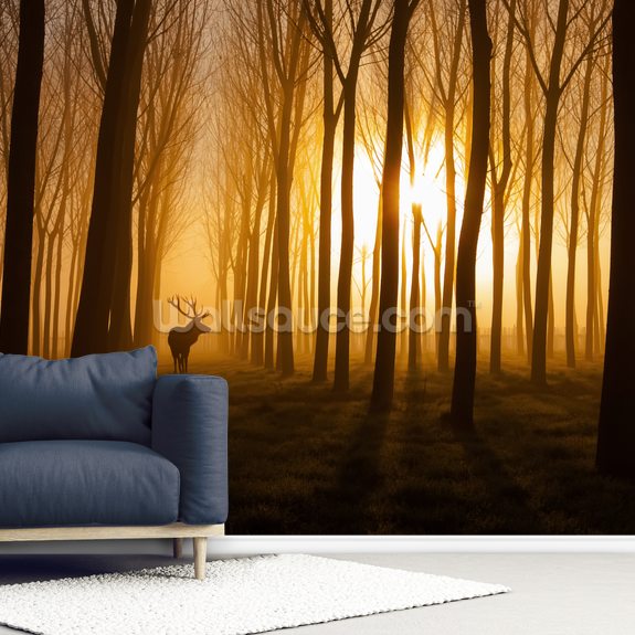 Warm and inviting, this Forest Stag wall mural showcases a beautiful stag basking in the morning sun. With just a silhouette to suggest its presence, this wonderful woodland wall mural will be perfect for a warm or rich toned interior, and as an accent wall or inset wall piece.