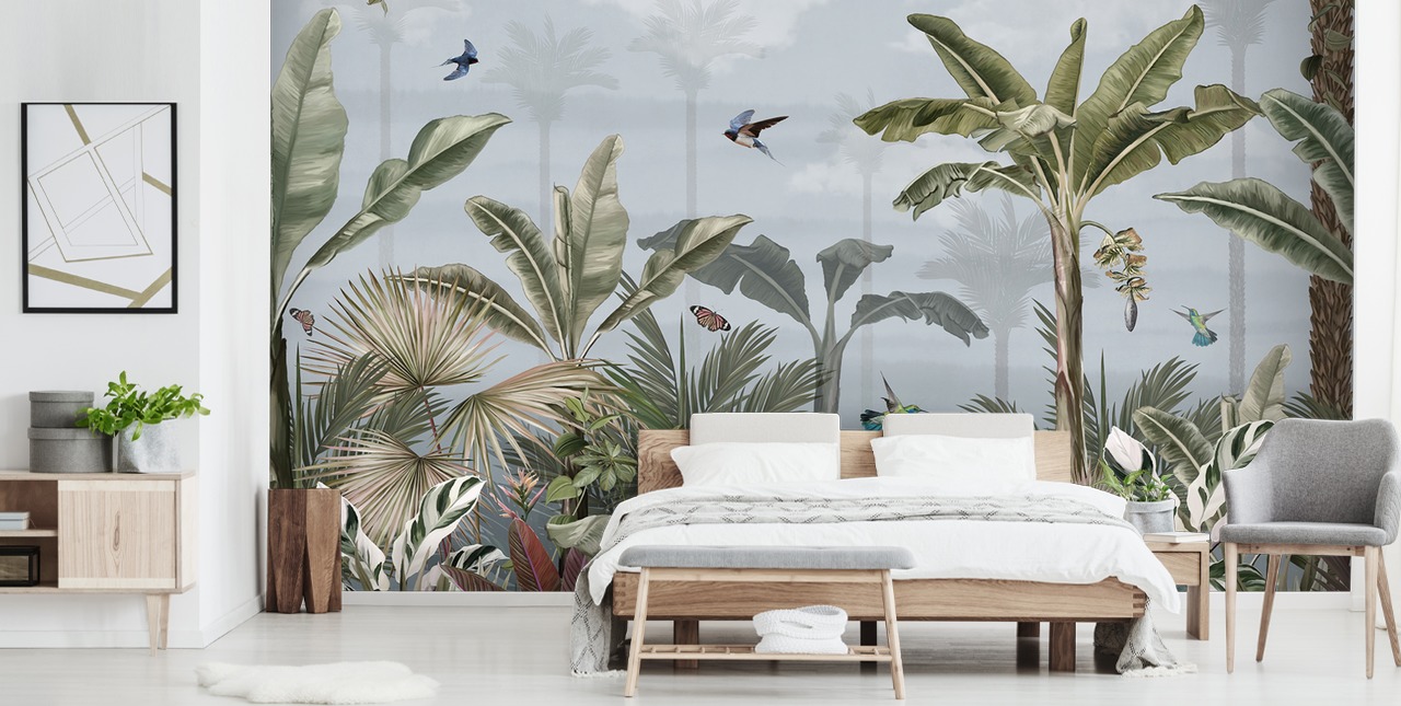 A Day In The Jungle Blue is a stylish and sophisticated jungle wallpaper mural that's perfect for bedrooms and living rooms.