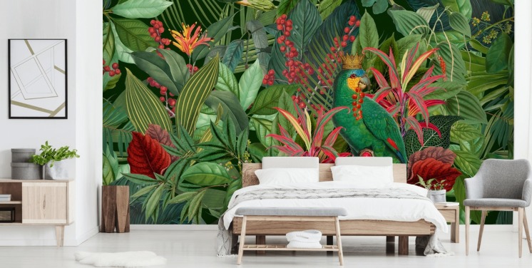 green and red customisable jungle wallpaper mural called Parrot King by Andrea Haase for bedrooms