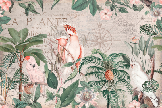 beige tropical wallpaper mural called Wistful Cockatoo Jungle Mural by Andrea Haase for bedrooms and living rooms