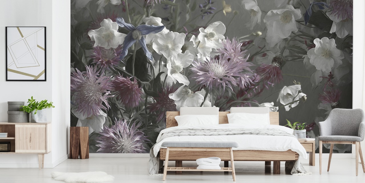 Infuse your living room, bedroom or dining room with drama and beauty with the Anemonies wallpaper mural by Marina Stupakova.