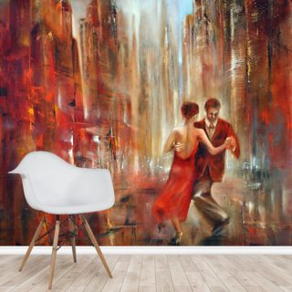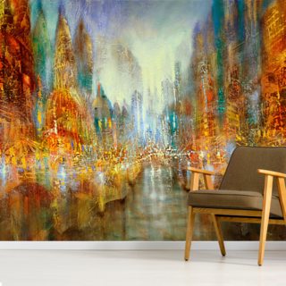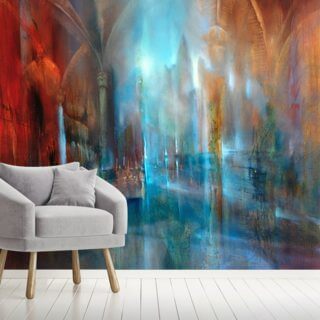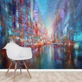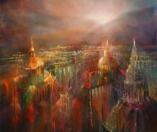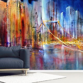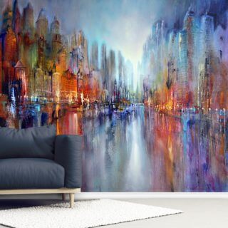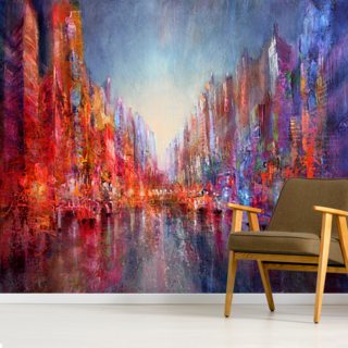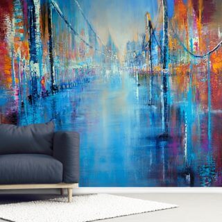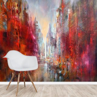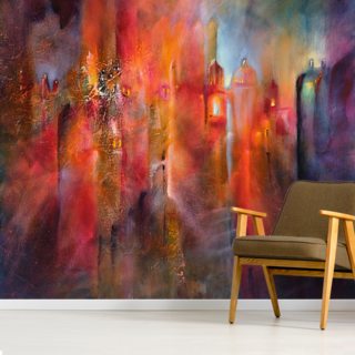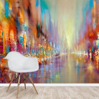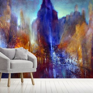 Colourful abstract painting of a sunset with reds, blues and yellows