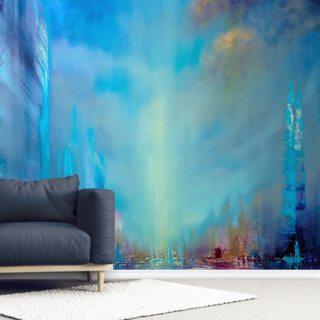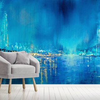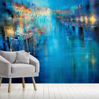 Blue abstract painting of a river, distant mountains anda blue and beige sky