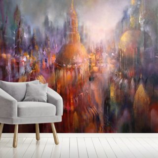 Abstract painting of a yellow and pink landsape with the sun shining through the clouds