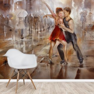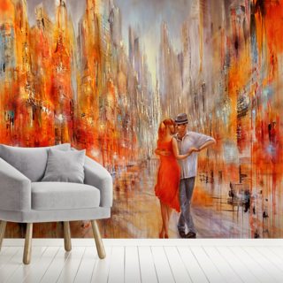orange and red clouds amongst blue sky over pink heathland painting wallpaper