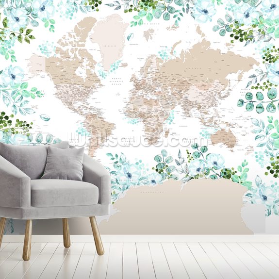 Because of the floral frame in this world map wallpaper, we would recommend installing it in your bedroom. Florals are not only romantic but bring a sense of nature in a room which is great for the place in which you sleep. To allow this floral map wallpaper flow throughout the room, choose a range of décor in tones of blue and green to mirror the shades of the flowers.