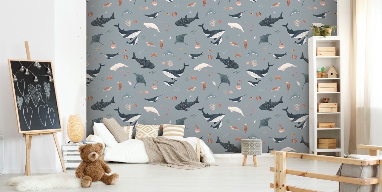 Transform your nursery or child's bedroom with Blue Splendid Sea, a charming children's sea life wallpaper mural from Kikki Belle.