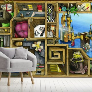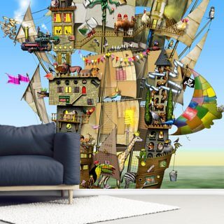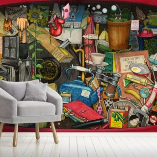 colourful custom drawn book wallpaper mural called Neverending Stories by Colin Thompson for child's bedroom or library