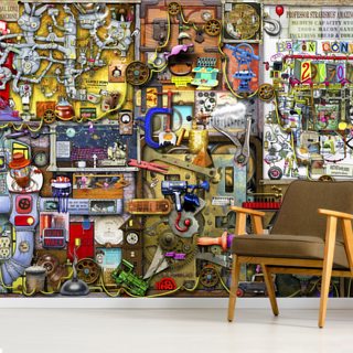 colourful custom kids bookshelf wallpaper mural called Bookshelf by Colin Thompson for child's bedroom or playroom