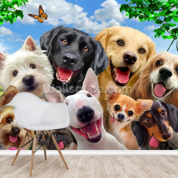Does your child love dogs? Then this wallpaper will be perfect in their bedroom or as an accent wall in their playroom. It includes many different breeds of dog within this selfie, such as Labradors and Chihuahuas.