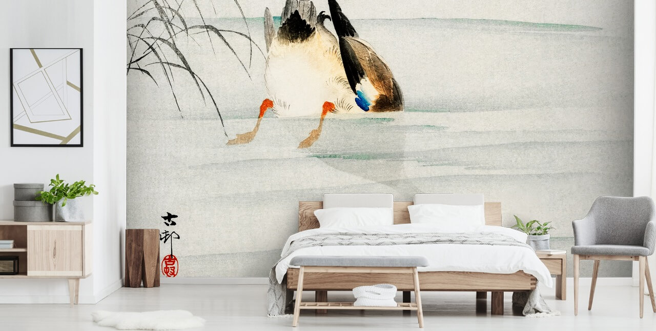 Do you love nature and adorable mallard ducks? Then why not enjoy this sweet Mallard the Head Under Water wallpaper mural painted by the talented Ohara Koson?