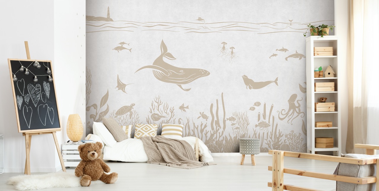 Transform a child's bedroom or playroom into a magical underwater scene with Monochrome Sea - Vintage White wallpaper by Kikki Belle.