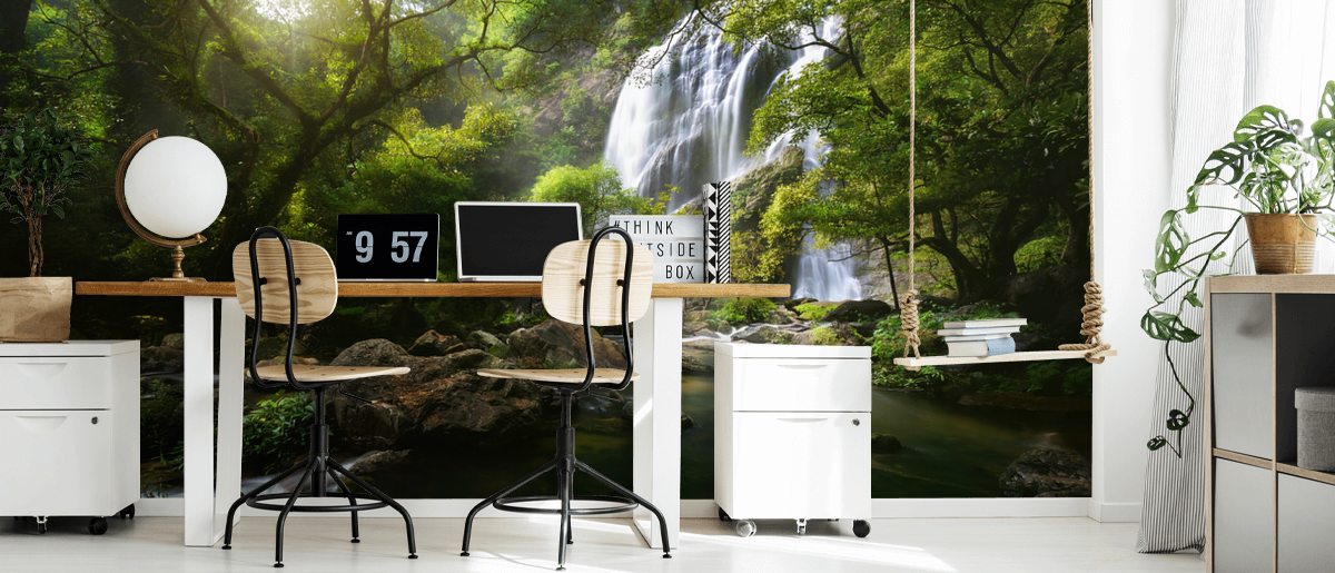 Completely versatile, this stunning waterfall wallpaper would look ideal in any room -whether your lounge, bedroom, dining room or bedroom: the choices are endless! Keep your stable furniture choices simple. Op for natural woods but invite touches of green into the room through your selection of room accessories. A sage green blanket, either on the end of your bed or thrown onto your sofa, is a great way of doing this.