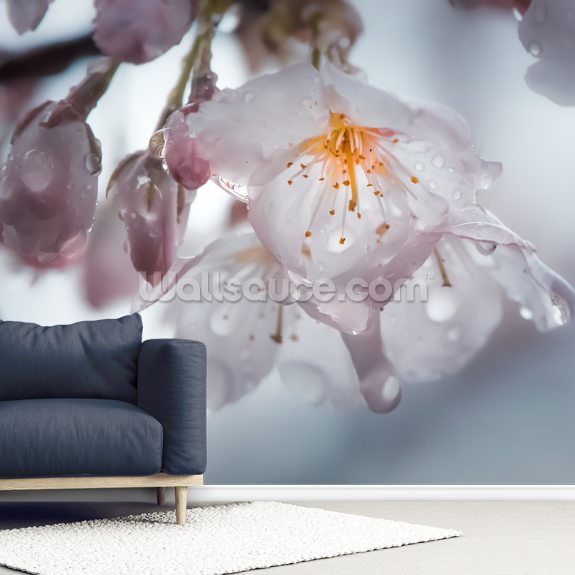 The close-up image of the cherry blossom with raindrops delicately dropping off it makes a stunning look for this custom-made wall mural.