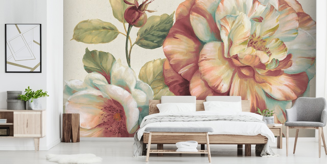 This exquisite botanical mural sets a scene of flourishing blooms in muted shades of blush and greenery, capturing the serenity of a quiet afternoon in a blossoming garden. It is the perfect solution for transforming your room into a serene sanctuary.