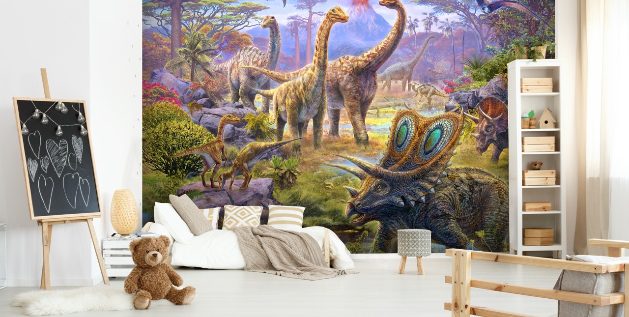 Step back in time and start new adventures alongside these amazing ancient beasts in our stunning Sauropods wallpaper. Full of colour and immense detail, your dinosaur-obsessed child will be amazed when they see this fantastic dinosaur wall mural installed on their bedroom wall!