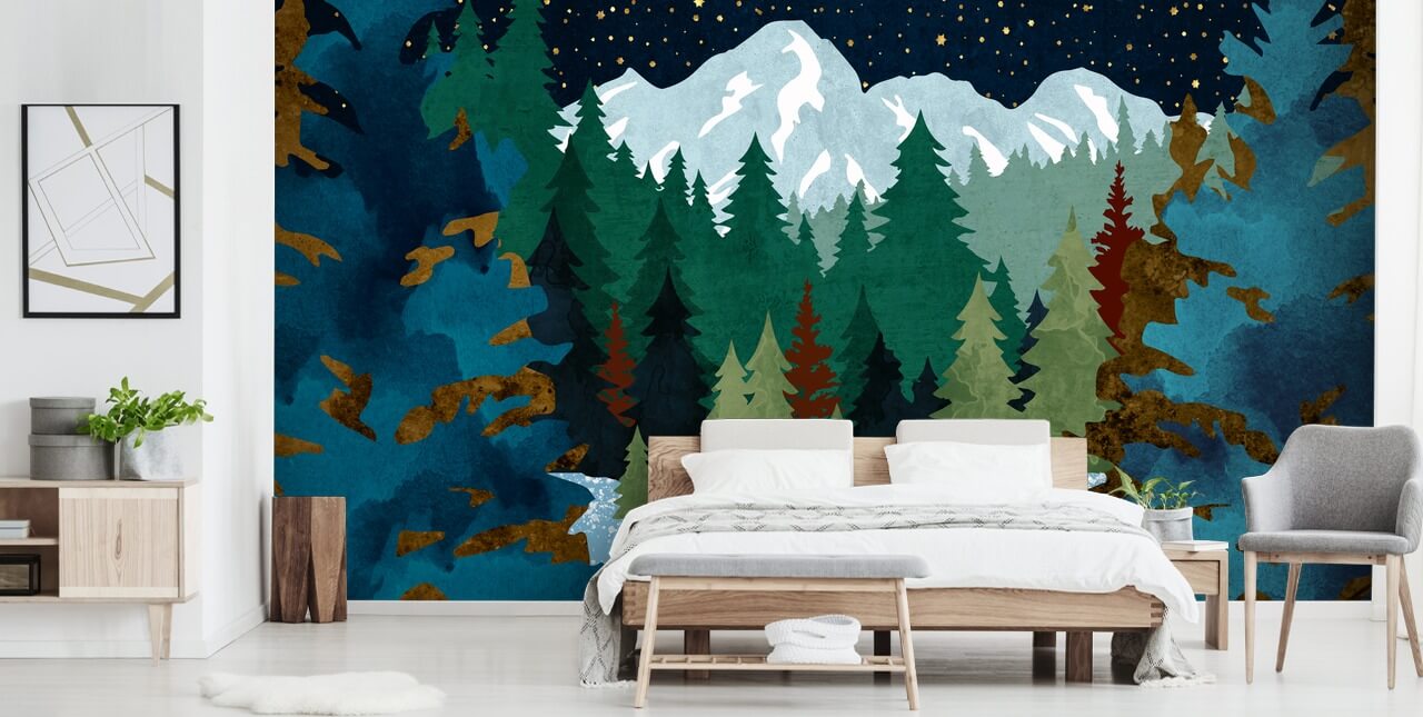 Style this mural with an exposed wooden bed and matching bedside units. Choose navy bedsheets and decorate them with bronze cushions. Add in some warm white lighting in the form of bedside lamps or dangling fairy lights above your bed. Bedtime will never have looked so cosy!