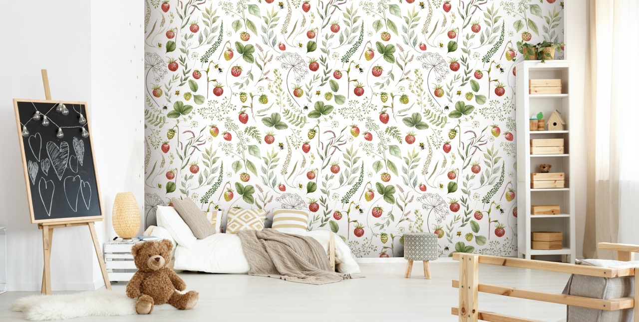 Choose this beautifully charming Strawberry Hill wallpaper mural from Kikki Belle. Perfect for a nursery, playroom or child's bedroom!