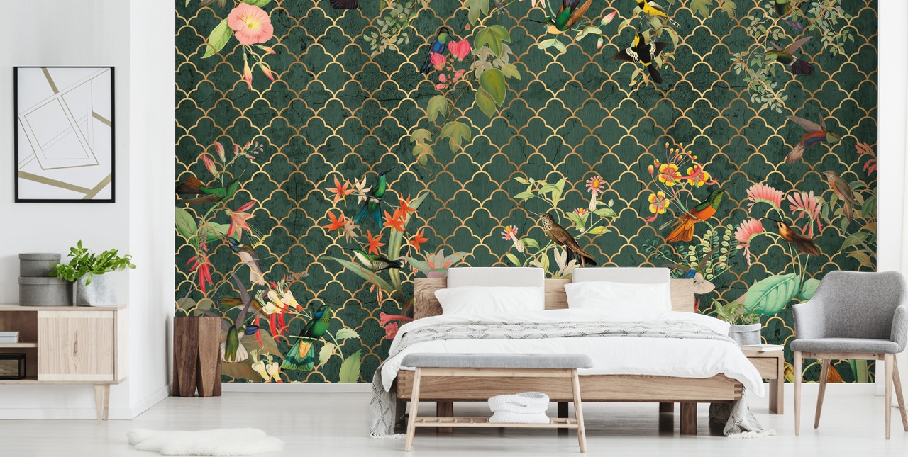 Treat yourself to a gorgeous emerald green feature wall with this made-to-measure Tropical Birdlife wallpaper from Wallsauce.com.