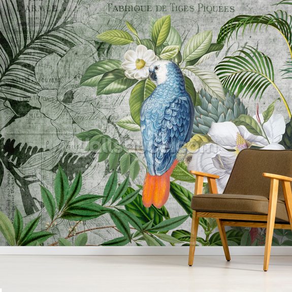 Opdater din indretning med denne stilfulde jungle tapet af vores konkurrence vinder, Andrea Haase. Med en smuk papegøje i tropiske omgivelser, vil denne jungle vægmaleri give dig en fantastisk feature væg i soveværelset, kontoret eller stuen.