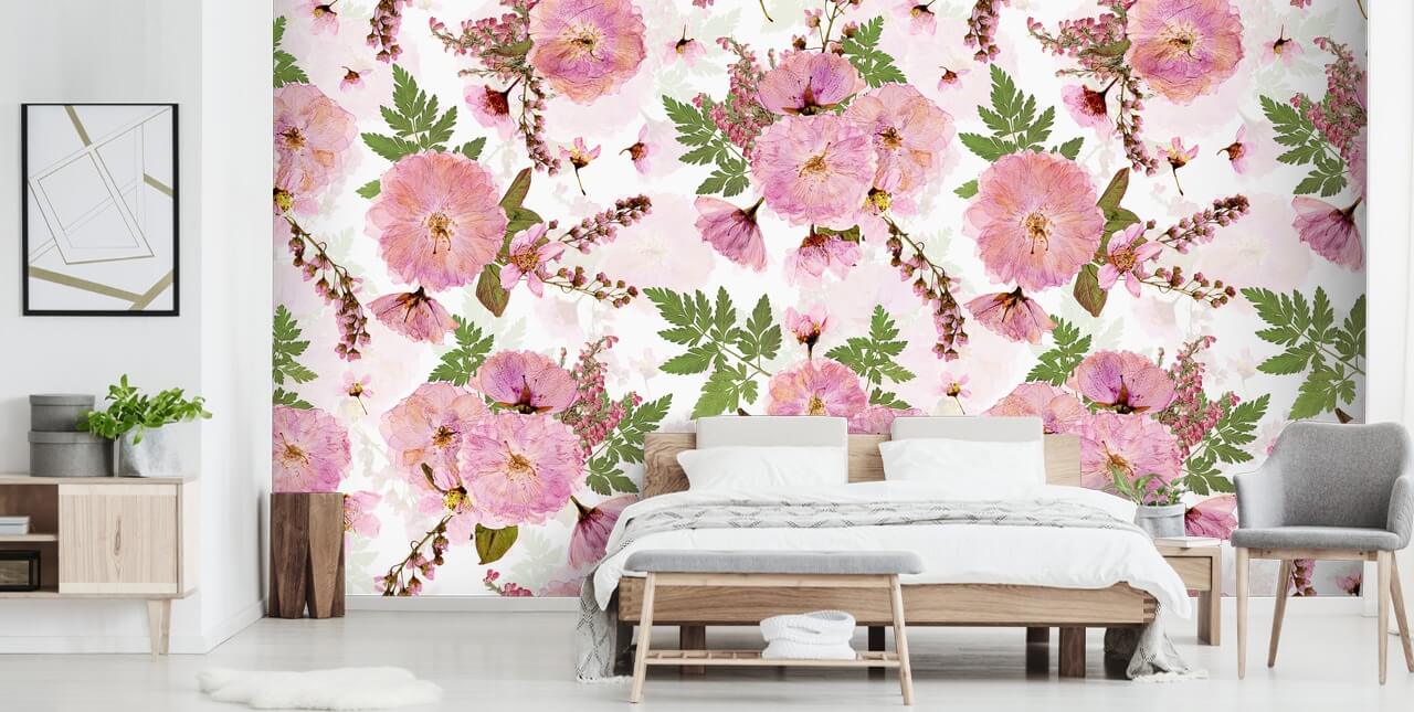For at gå med denne fantastiske blomst tapet, male de omkringliggende vægge med hvid eller lyserød maling og vælge hvide dynebetræk og pink scatter puder.