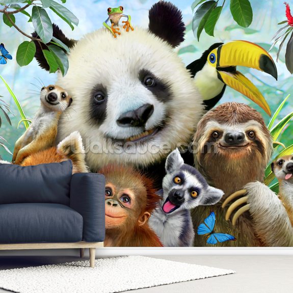 Forvandl dit barns soveværelse med dette søde Zoo Selfie vægmaleri. Skræddersyet til at passe perfekt til din væg.