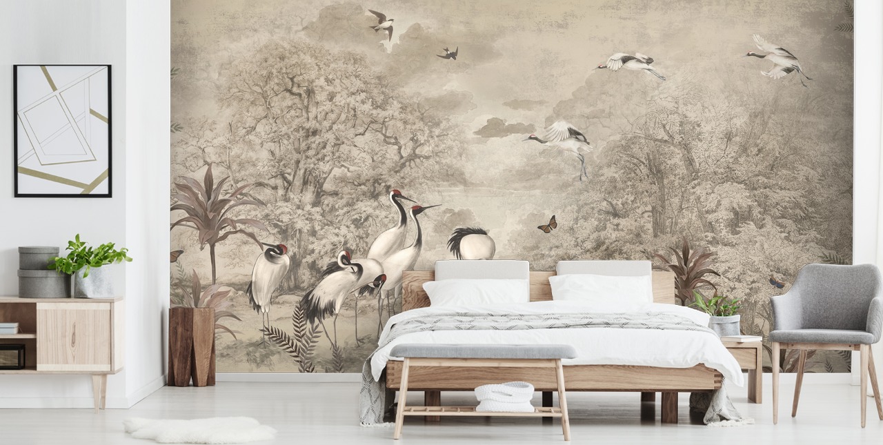 Jungle Cranes tapetvægmaleri, grå og sepiatoner. Lavet til mål.