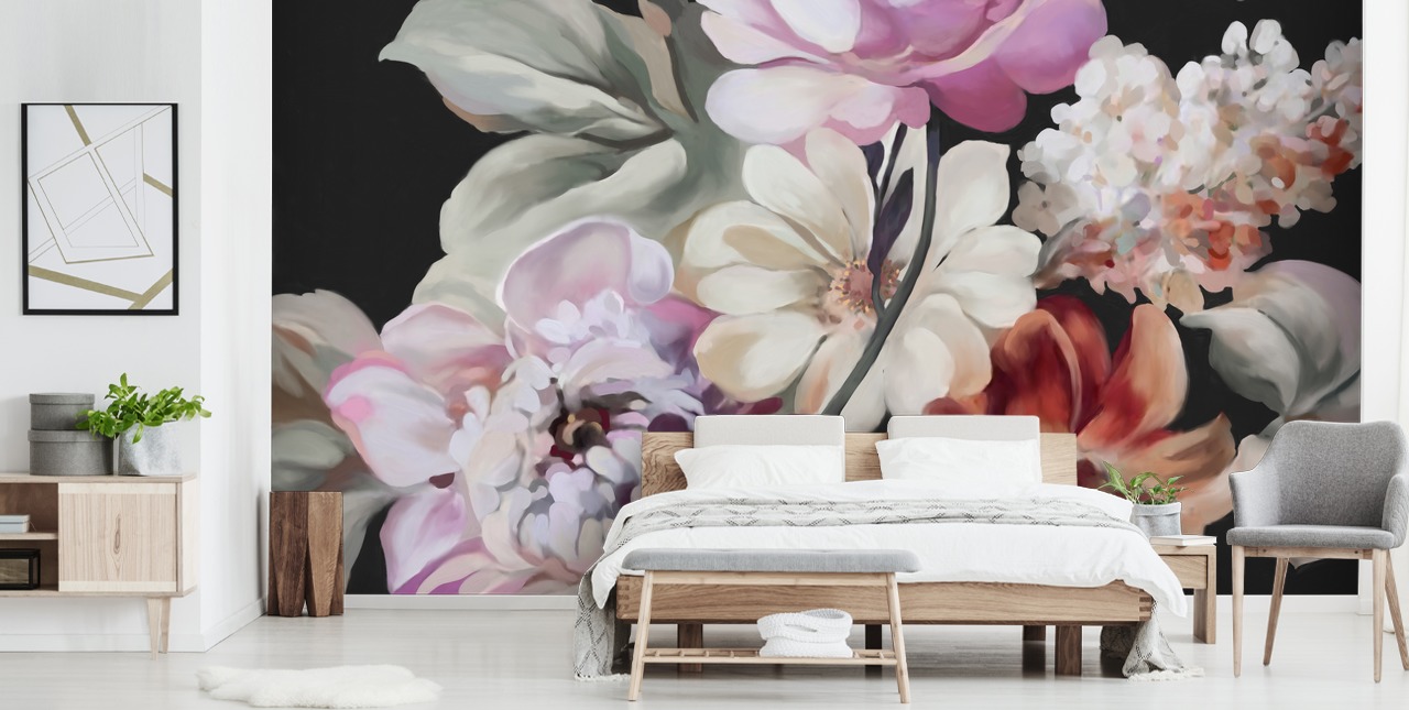 Hvis du er på udkig efter en luksuriøs mørk blomstret tapet, så vælg denne smukke Midnight Garden tapet. Vi tror, at denne smukke lyserøde blomst tapet ville se fabelagtig som en funktion væg i en romantisk soveværelse. Installer det bag din seng for at fungere som en forlængelse af hovedgærdet. Vælg en knust fløjl pastel pink hovedgærde og hvidt sengetøj. Vælg mørke blomstermønstrede scatter puder med lignende toner som blomstermaleriet og har meget lyse, pastelgrå møbler såsom natborde og et toiletbord.