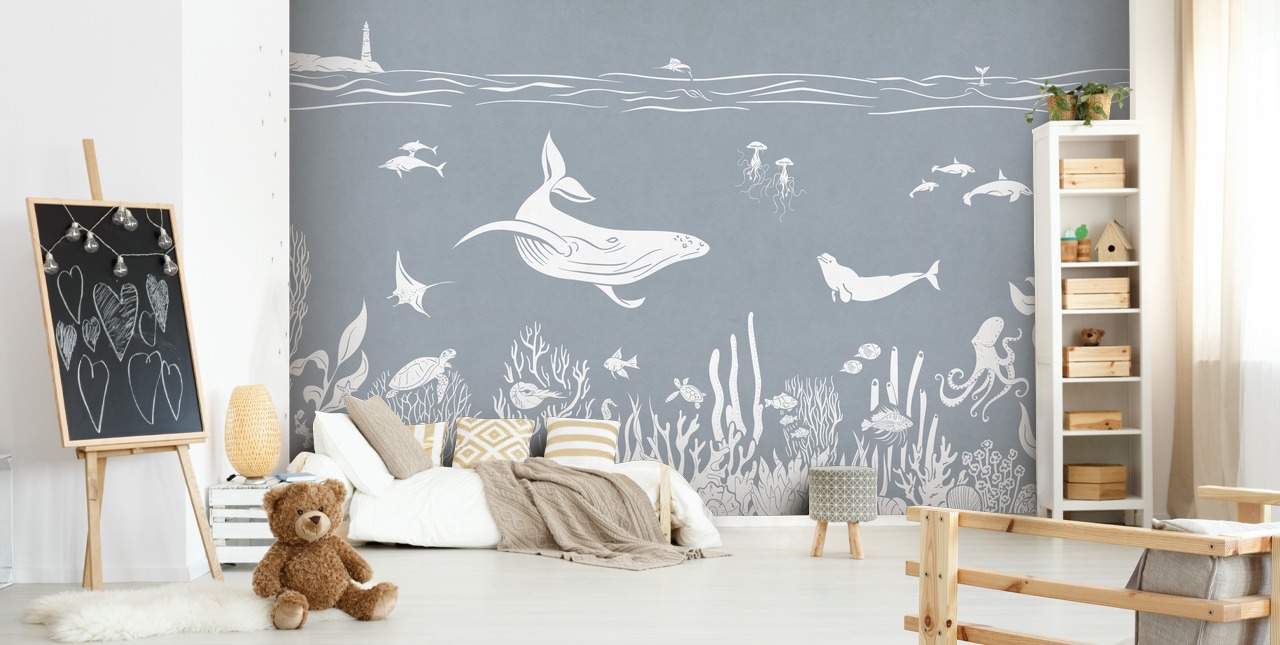 Bring stil til dit barns soveværelse med dette smukke monokrome hav i blå vægmaleri af Kikki Belle.