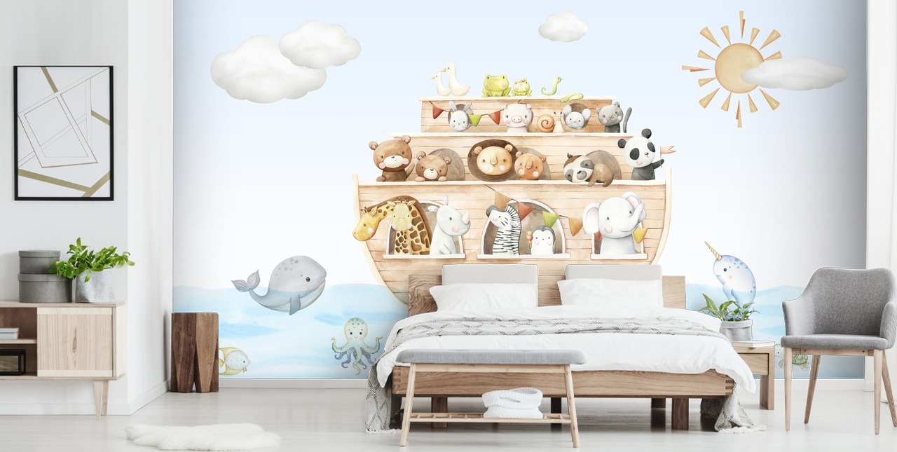 Pynt dine børnehavevægge med det søde Noah's Journey tapetmaleri af Oliver Robins.