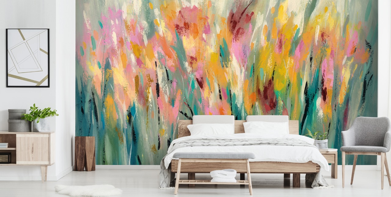 Forvandl dit opholdsrum med vores Summer Garden Joy vægmaleri af Silvia Vassileva