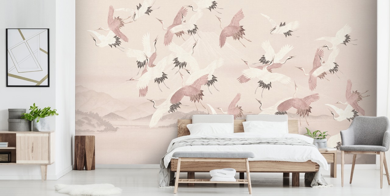 Bring tidløs elegance og stil til dit hjem eller din virksomhed med Vintage Flying Cranes tapetmaleri af Bloomery Decor.