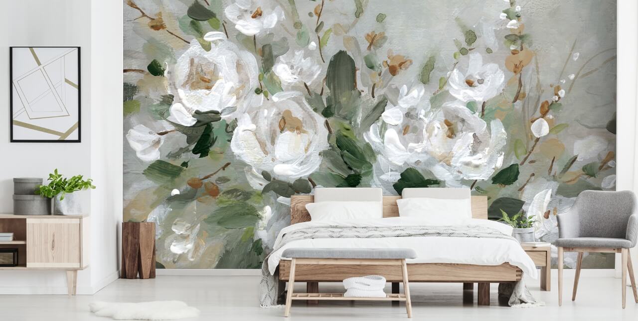 Hvis det er installeret i din romantiske boudoir, skal du placere den foran din seng, så du kan nyde den, når du sidder op i sengen. Mal væggene i en off-white tone for at bringe kronbladene ud og har sprød hvid strøelse til at matche. Dekorer din seng med grå og skovgrønne spredepuder for at invitere mere farve og varme ind i rummet. For at bestille, alt hvad du skal gøre er at fortælle os din væg dimensioner og valg af tapet materiale.