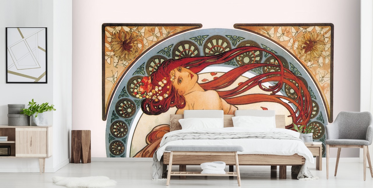 Tilføj tidløs stil til din indretning med vores skræddersyede Dance (Rose) af Alphonse Mucha tapetmaleri.