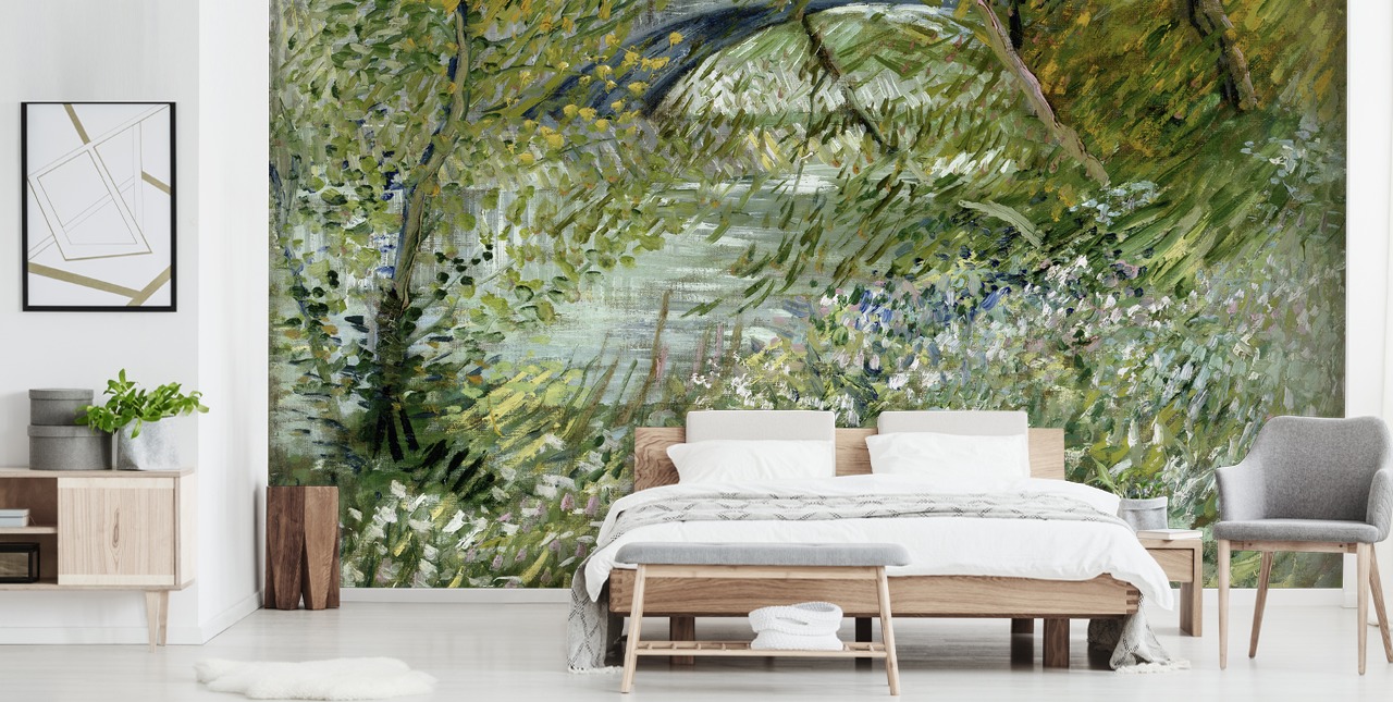 Vis din kærlighed til klassisk kunst ved at bringe van Goghs flodbank om foråret ind i dit hjem som et fantastisk vægmaleri.