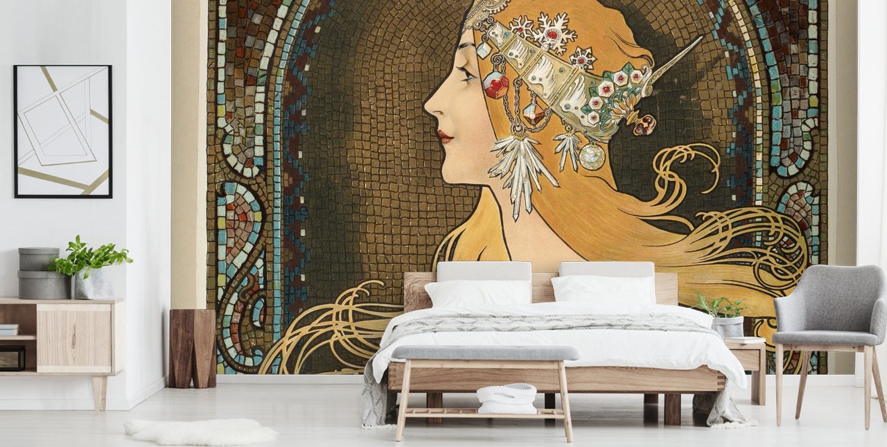 Opret en statement accentvæg i dit hjem eller din virksomhed med Zodiac-tapetmaleriet af Alphonse Mucha.