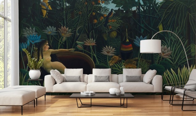 farverigt kunsttapet vægmaleri kaldet Eksotisk landskab af Henri Rousseau