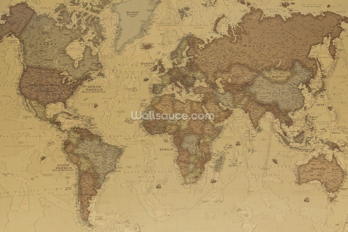 Skræddersyet Rustic World Map tapetmaleri. Sofistikerede og elegante verdenskort tilføjer et rigtigt talepunkt.
