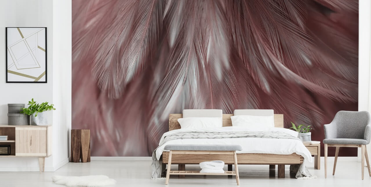 Vælg denne fantastiske og on-trend Ash Pink Feather vægmaleri til dit soveværelse... Custom-made og leveres i paneler.