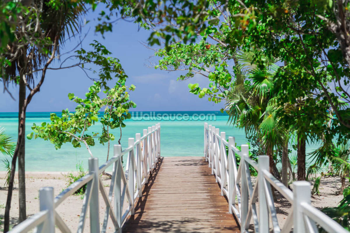 Føl dig som om du lige har trådt ud af din strand hytte og gør din vej til din private strand med denne smukke bro til stranden tapet vægmaleri fra vores strand kategori. De turkise farvande, hvide sand og bladgrønne tropiske planter vil transportere dig til paradis.