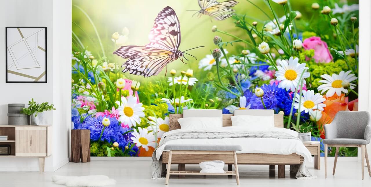 De forskellige blomster kombineret med de to sommerfugle, der flyver over, gør dette fotografiske naturtapetmaleri til et lyst og smukt naturskønt billede. Kontrasten i farver og lyset fra solen i øverste venstre hjørne tilføjer et flot prikken over i'et og vil give dit værelse den indbydende glød.