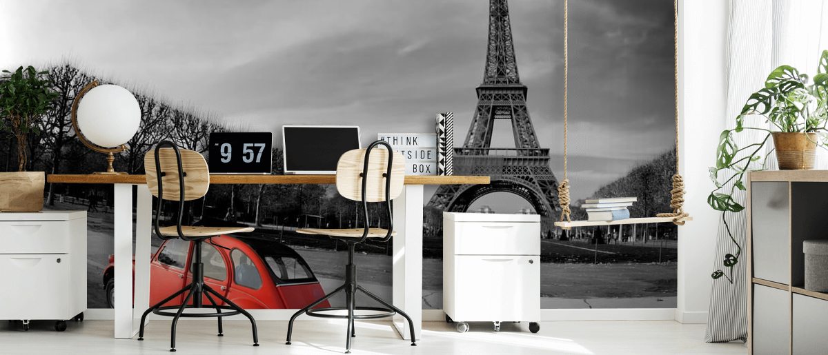 Denne klassiske sort og hvid Paris vægmaleri er simpelthen perfekt til vintage look. Med den ikoniske røde VW Beetle, vil denne fantastiske Paris vægmaleri se godt ud i ethvert hjem eller i virksomheder som detailforretninger.