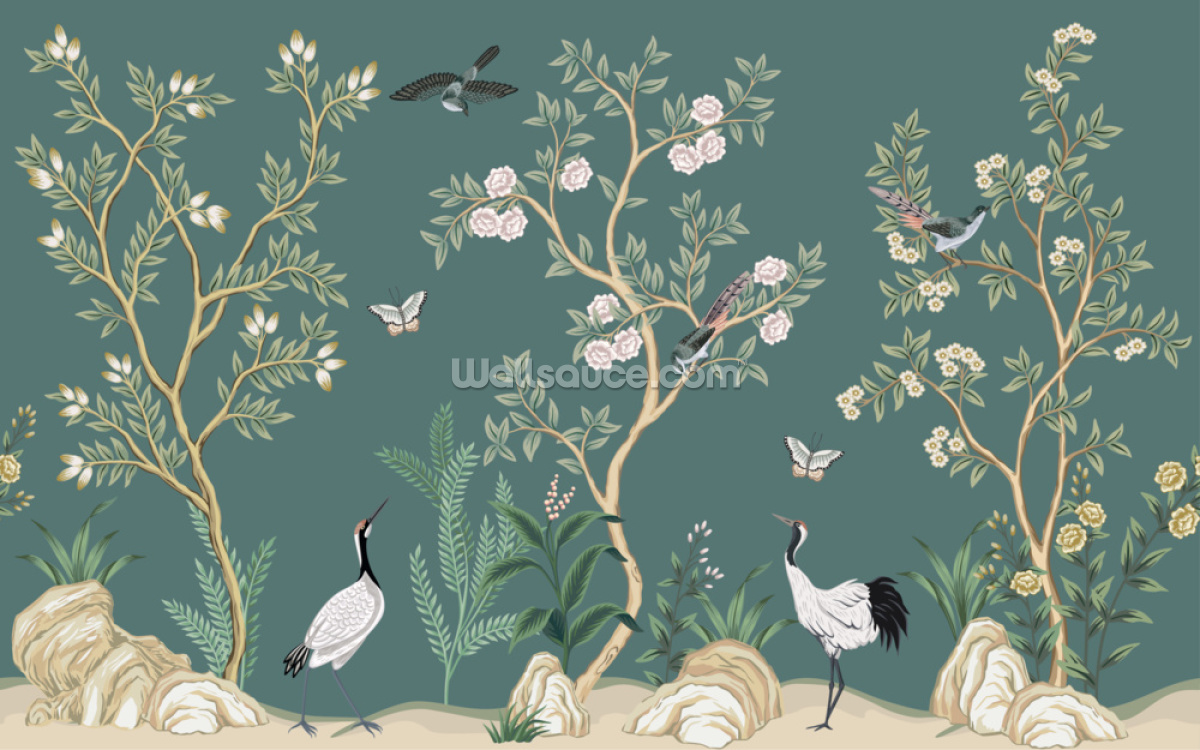Bring stil og raffinement til ethvert rum i dit hjem med tapetmaleriet Green Chinoiserie Rose Garden.