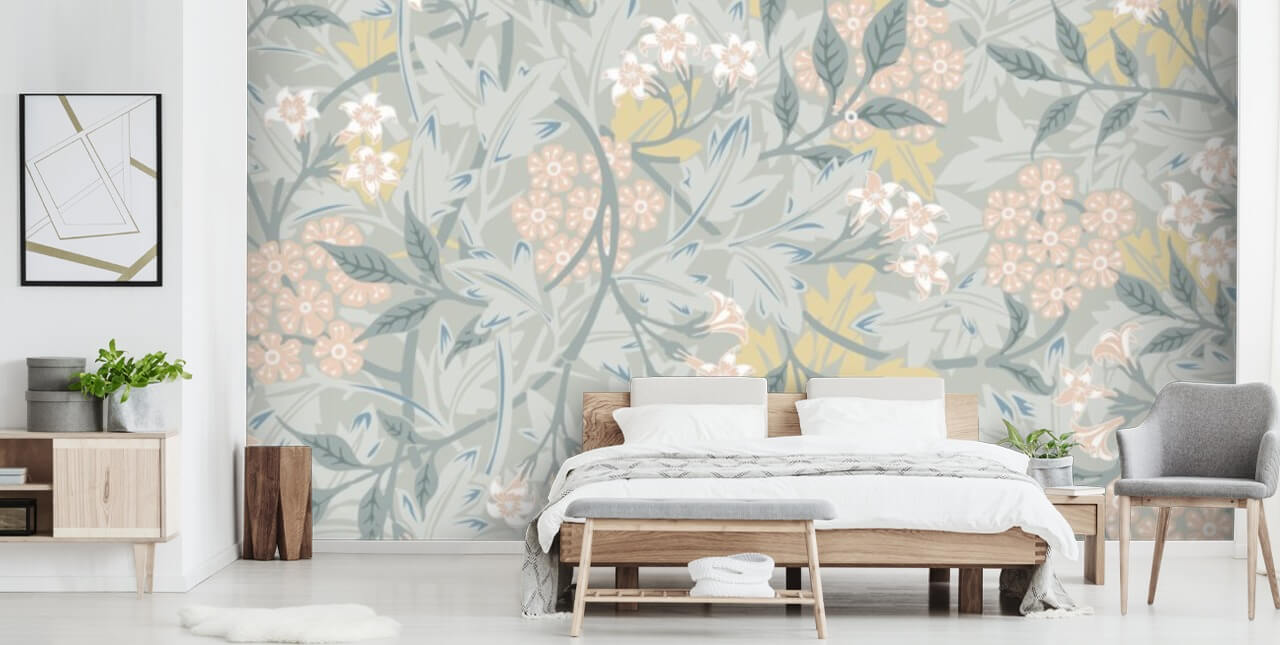 Dette smukke pastel blomstertapet vil bringe glæde til ethvert rum. Køb Jasmine-tapetmaleriet af William Morris på Wallsauce.