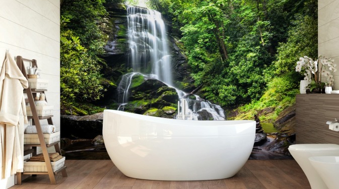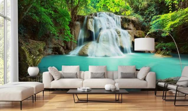 turkisblå brugerdefineret vandfald tapetmaleri kaldet Peaceful Waterfall til badeværelser og køkkener