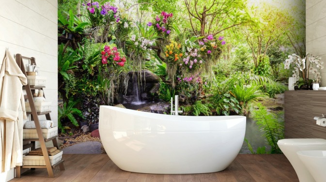 grønt brugerdefineret vandfald tapetmaleri kaldet Orchid Garden Waterfall til stuer